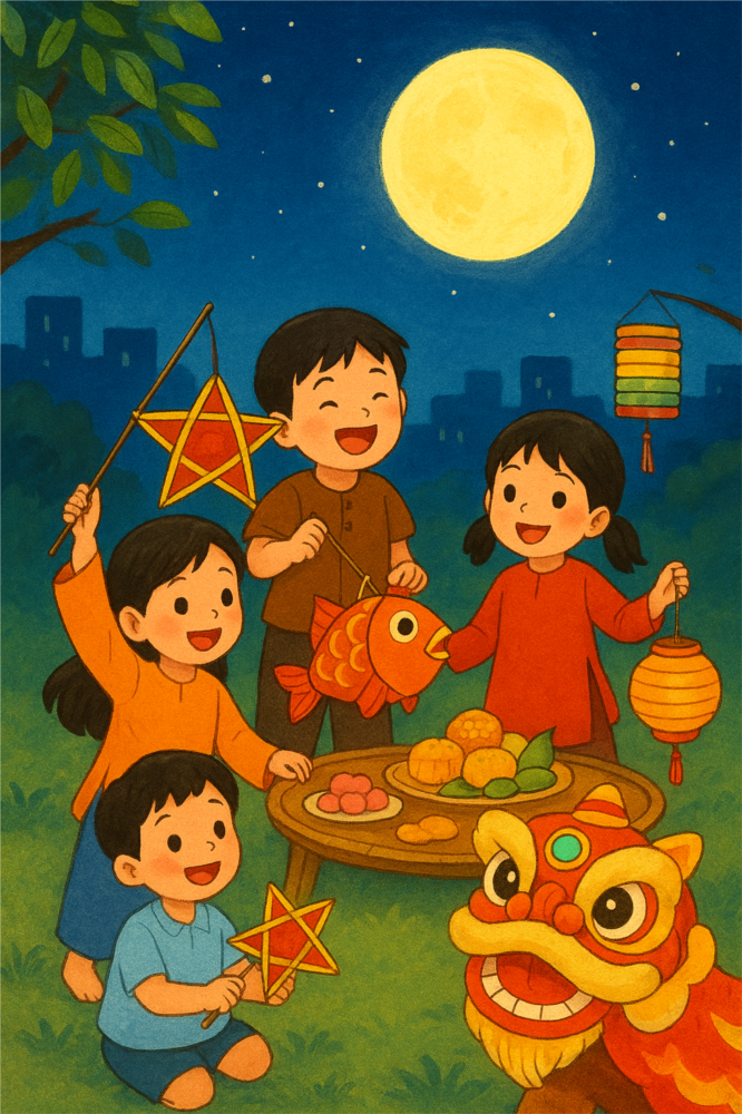 Từ bao đời nay, Tết Trung thu không chỉ là dịp để ngắm trăng, phá cỗ, mà còn là ngày hội của tình thân và niềm vui tuổi thơ. Trẻ em được cha mẹ sắm cho những chiếc đèn ông sao, đèn kéo quân, đèn cá chép lung linh sắc màu. Buổi tối rằm, các em nô nức rước đèn quanh xóm, tiếng trống lân rộn rã hòa cùng tiếng cười giòn tan vang khắp phố phường, thôn xóm.